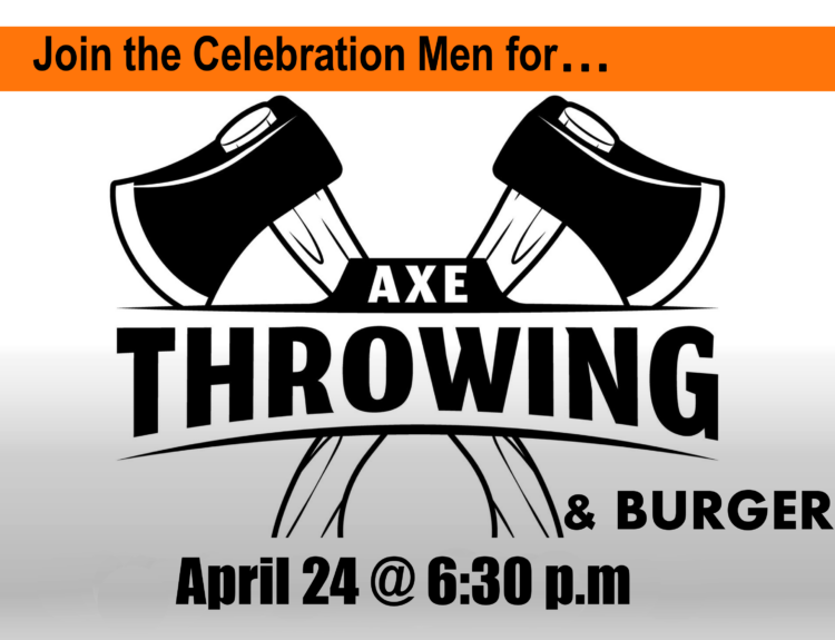 The Celebration:Men will gather on Friday, April 10 for Ax Throwing and Burgers. Starting time is 6:30 p.m. at the CBC facilities.