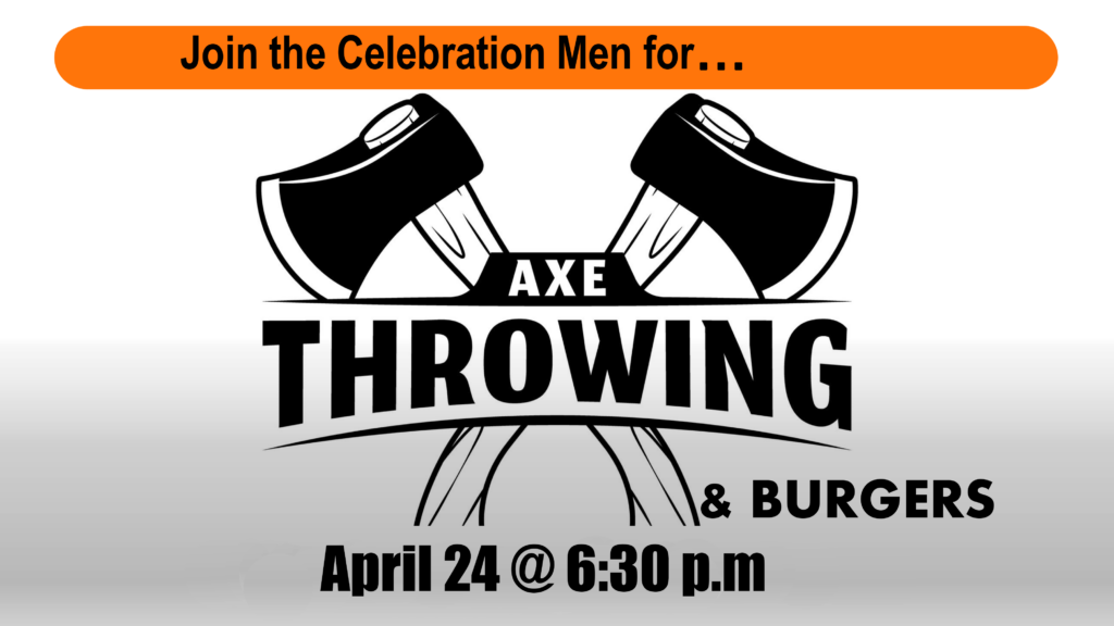 CELEBRATION: Men will host an Axe Throwing and Burger event on Friday, April 24 @ 6:30 p.m. All CBC Men and their guests are welcome.